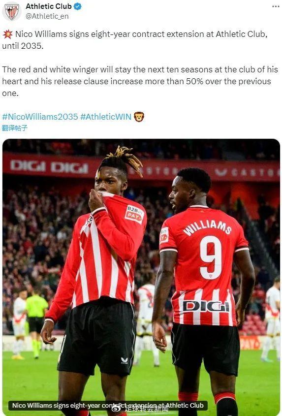官方:毕尔巴鄂竞技宣布和尼科-威廉姆斯延长8年合同(实际上是新签了10年的新合同,原合同2027年到期),双方续约到了2035年,同时他的违约金比原合同提高了50%(此前是5800万欧元左右,据悉续约后在9500万欧元左右)。