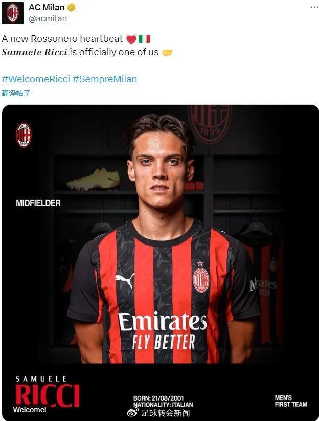 官方:米兰宣布从都灵签下了萨穆埃莱-里奇,这名中场签下了一份2029年到期的合同,附带延长一年条款。